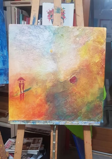 Technique mixte, collage, acrylique, sable et pigments sur toile de 30x30 cm.